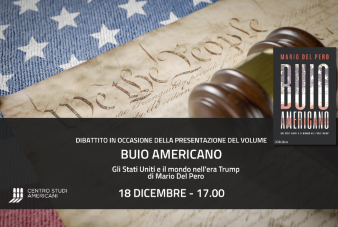 Mario Del Pero presenta il suo ultimo libro Buio americano. Gli Stati Uniti e il mondo nell’era di Trump in dialogo con Claudia Bernardi, Ferdinando Fasce e Daniele Fiorentino. Modera Oliviero Bergamini. Introduce Roberto Sgalla