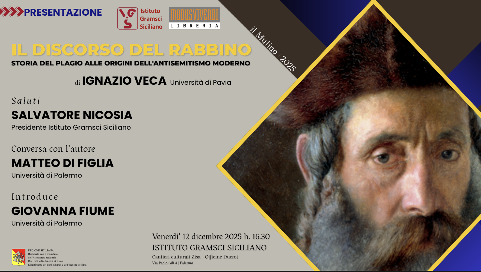 Ignazio Veca presenta Il discorso del Rabbino. Storia del plagio alle origini dell’antisemitismo moderno, saluti di Salvatore Nicosia, introduce Giovanna Fiume, dialoga con l’autore Matteo Di Figlia