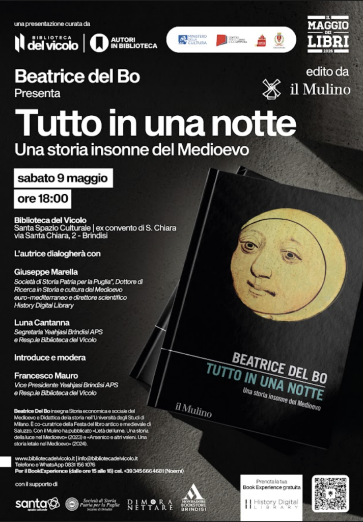 La Biblioteca del Vicolo, Santa Spazio Culturale ospita Beatrice Del Bo per la presentazione del suo nuovo libro Tutto in una notte. Una storia insonne del Medioevo in dialogo con Giuseppe Marella e Luna Cantanna. Introduce e modera Francesco Mauro. L’iniziativa si inserisce nel programma nazionale de Il Maggio dei Libri 2026